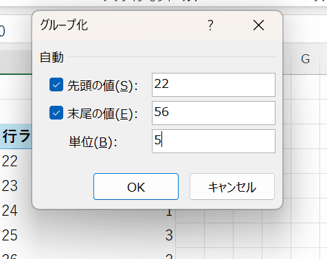 [単位] を設定します。これが「階級の幅」になります。例えば「5」と入力すると、「20-24」「25-29」...と5歳刻みになります。