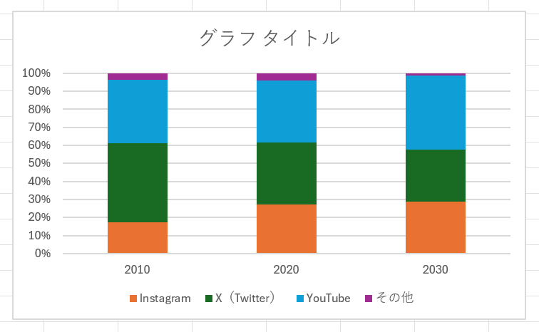 積み上げ棒グラフと似ていますが、こちらは各項目の合計がすべて100%になるように表示されます。そのため、合計の絶対数ではなく、「構成比率」を比較するのに特化しています。「各年代で、どのSNSの利用率が高いか」といった市場シェアやアンケート結果の比較分析に適しています。