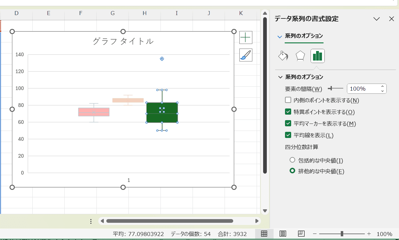 グラフのカスタマイズも「データ系列の書式設定」から可能で、色分け、外れ値の表示/非表示、散布図(内部ポイント)の重ね合わせが設定できます。