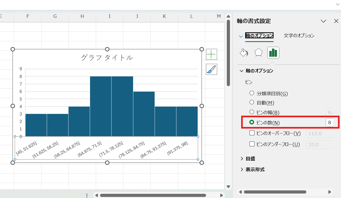 自動で作成されたグラフでも十分ですが、より分析しやすくするために階級(ビンの数や幅)を調整しましょう。
