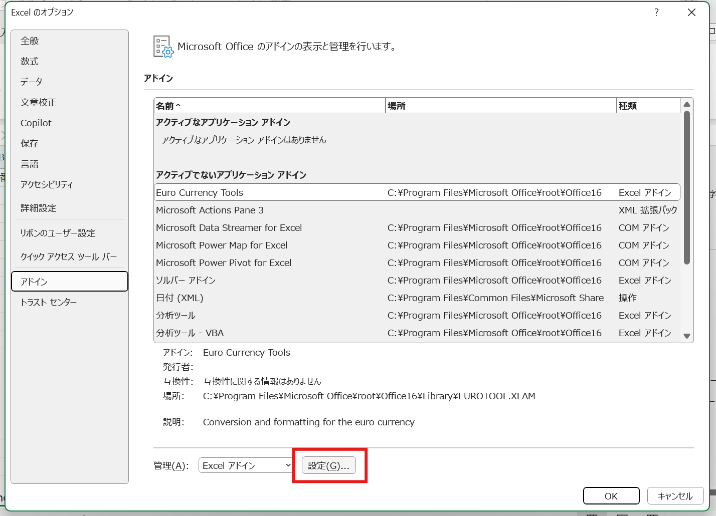 「ファイル」→「オプション」→「アドイン」と進み、管理で「Excelアドイン」を選択して「設定」をクリックします。