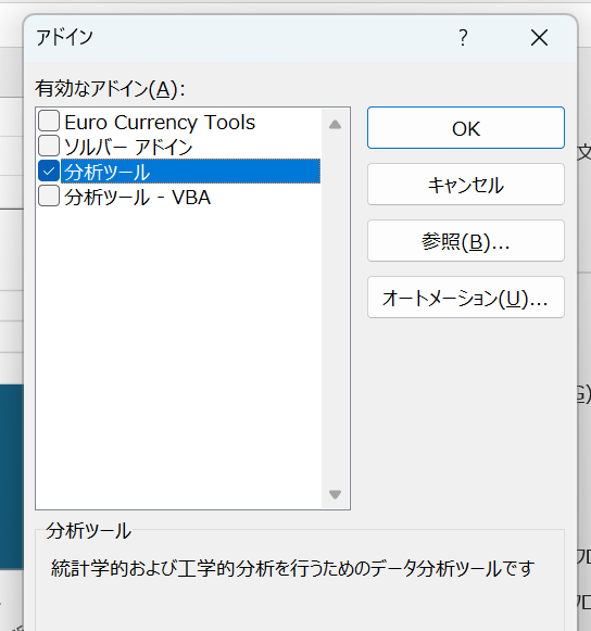 「分析ツール」にチェックを入れてOKを押します。(初回のみ必要な設定です)