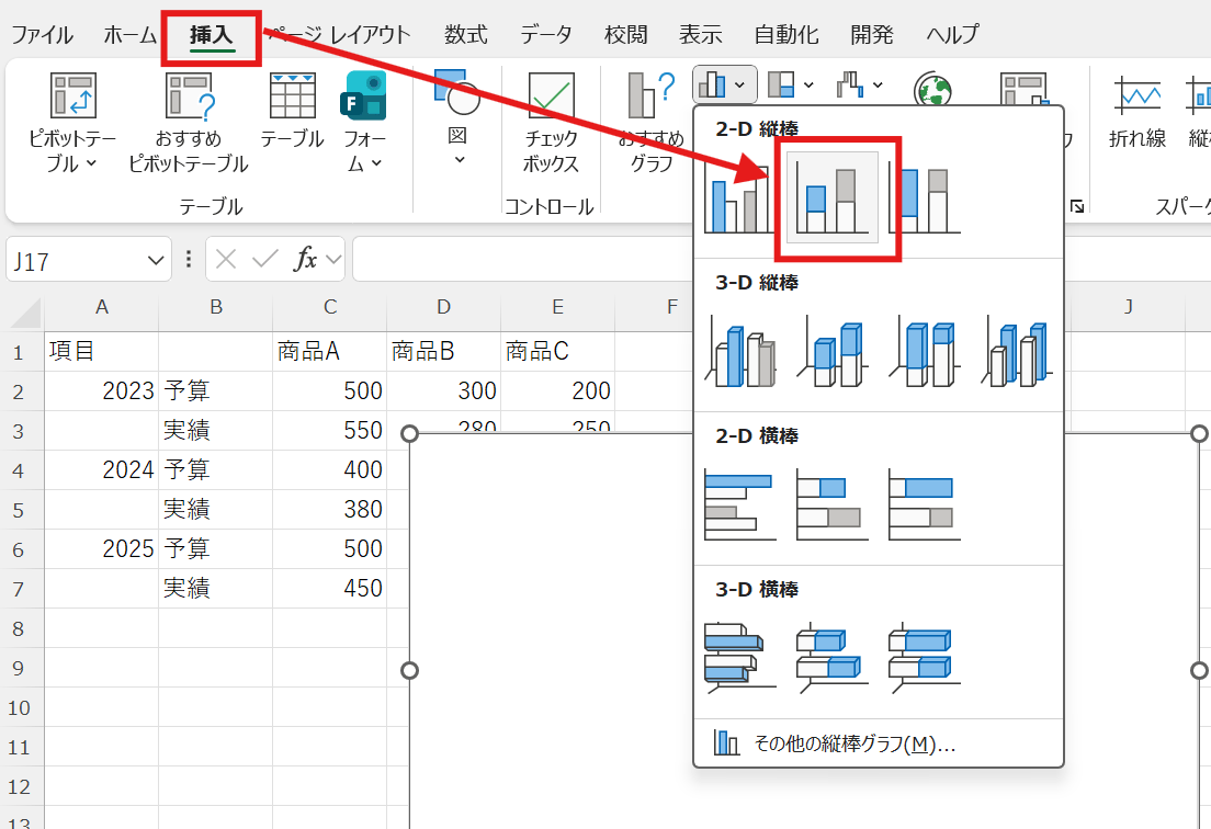作成した階段状のデータ範囲を選択し、「挿入」タブから「積み上げ縦棒」を選択します。