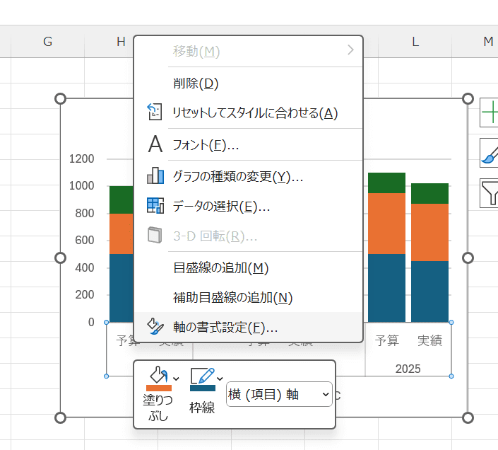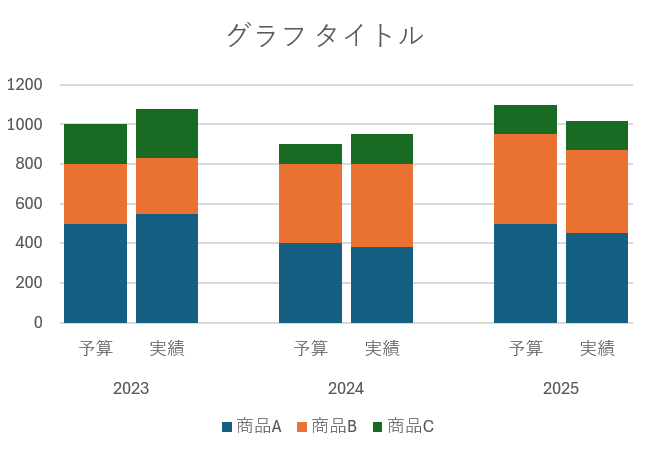 「今年度の『予算』と『実績』を、それぞれ積み上げ棒グラフにして横に並べて比較したい」