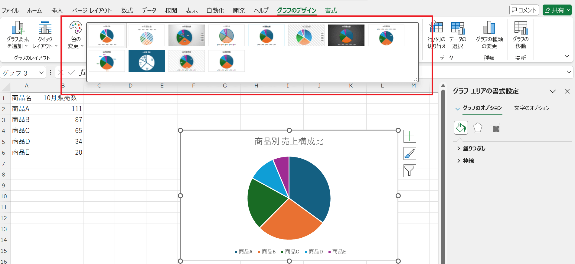 挿入された直後のグラフにはこの例では「10月販売数」というタイトルが入っています。この部分をクリックして、内容が伝わる分かりやすいタイトル(例:「商品別 売上構成比」)に変更しましょう。