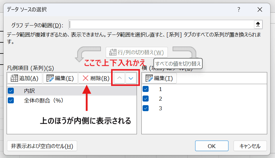 上にある系列が円グラフでは内側に配置されます。