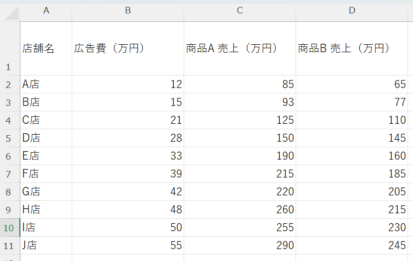 それでは早速、Excelで散布図を作成する基本的な手順を見ていきましょう。今回は、「各店舗の月間広告費(x軸)と売上(y軸)の関係」を分析する、というサンプルデータを使います。