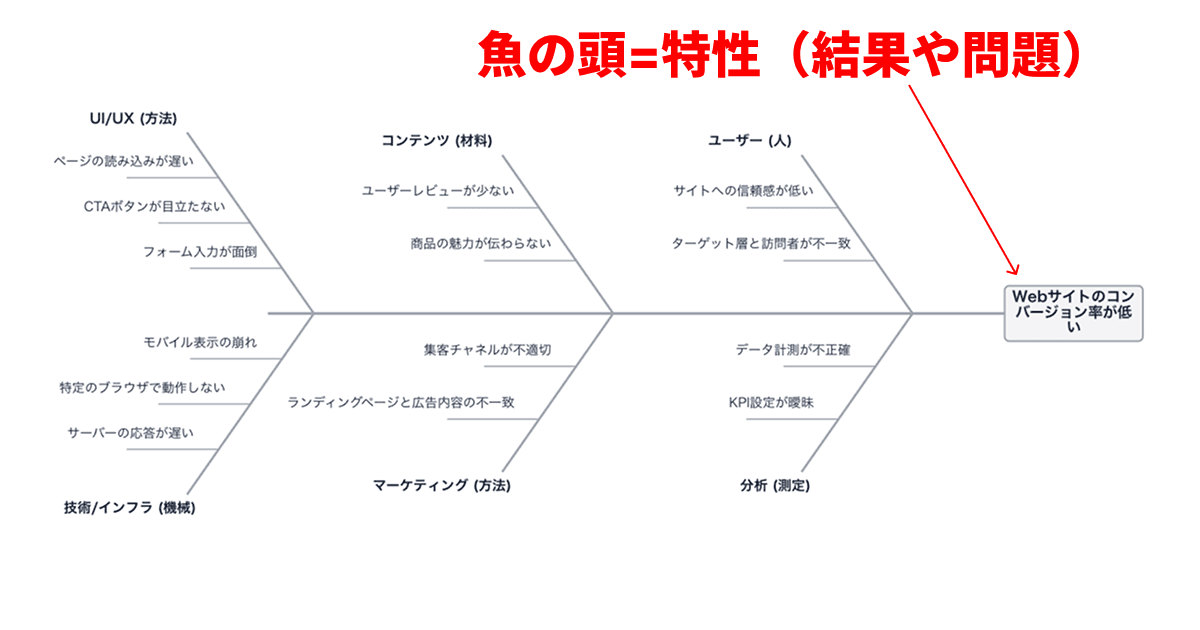 特性要因図は、問題(特性)と要因の関係を魚の骨の形で整理した図