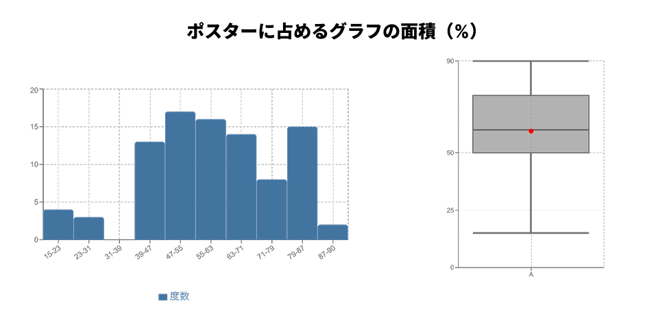第72回入賞作品(小学1年生から6年生までの部、計92作品)では、作品全体の平均で約 59.5%、中央値(真ん中の値)で 60% をグラフが占めていることが分かりました。