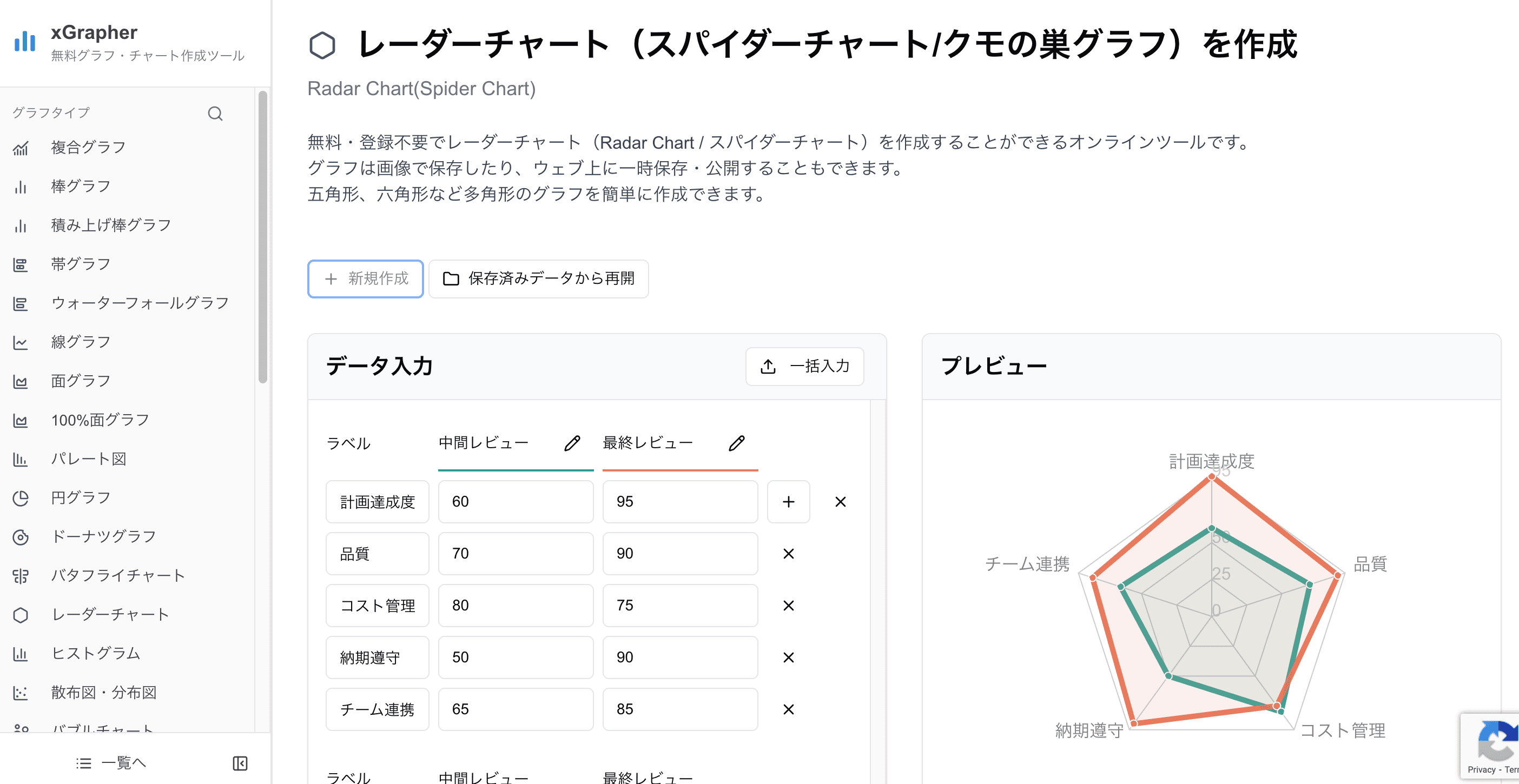 「レーダーチャートって、作るのが難しそう…」と感じるかもしれませんが、専門的なソフトは必要ありません。当サイト「xGrapher」を使えば、誰でも無料・登録不要で、あっという間に美しいレーダーチャートを作成できます。