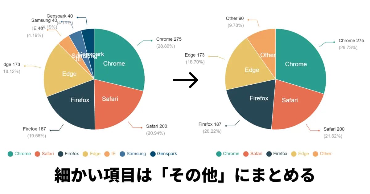 円グラフの項目が多すぎると、一つ一つの要素が小さくなり非常に見づらくなります。理想は5つ以内です。もし項目が多い場合は、「その他」として一つにまとめる工夫をしましょう。