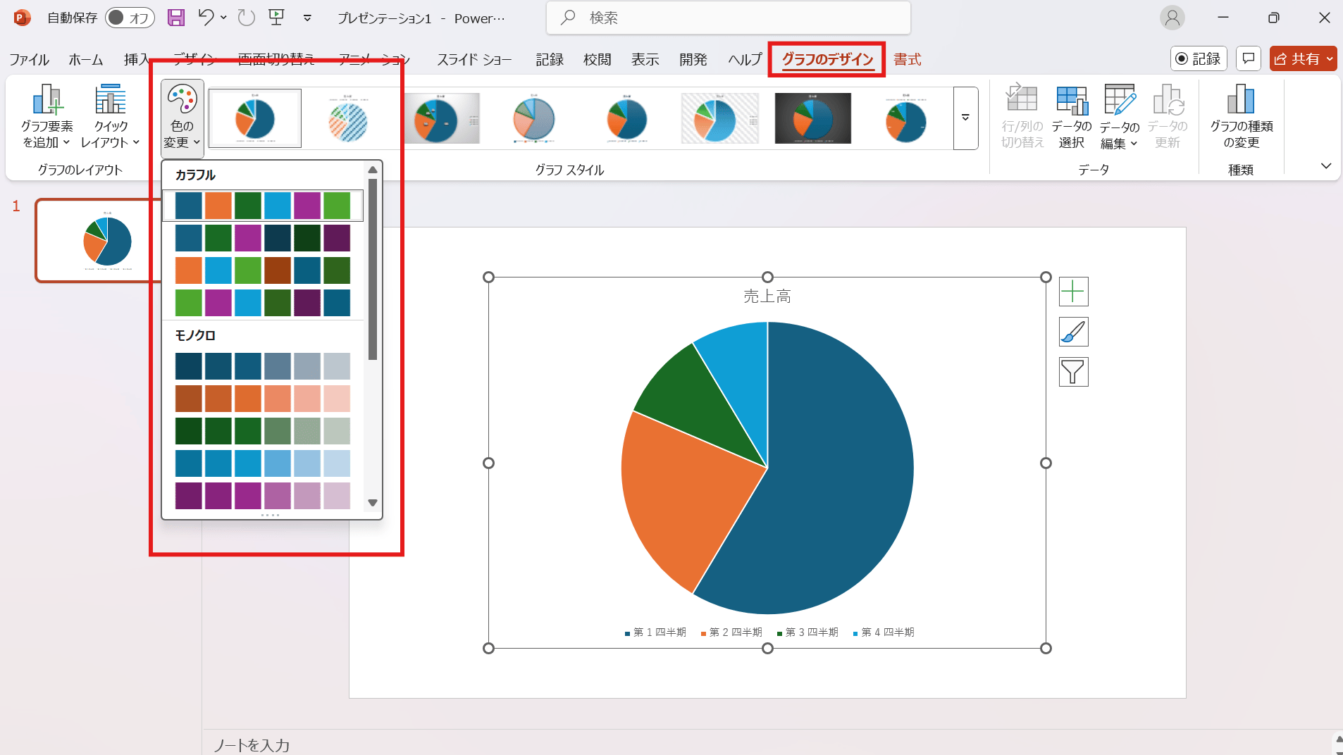 グラフ全体の色合いを変えたい場合は、グラフを選択した状態で「グラフのデザイン」タブの「色の変更」から好みの配色パターンを選べます。