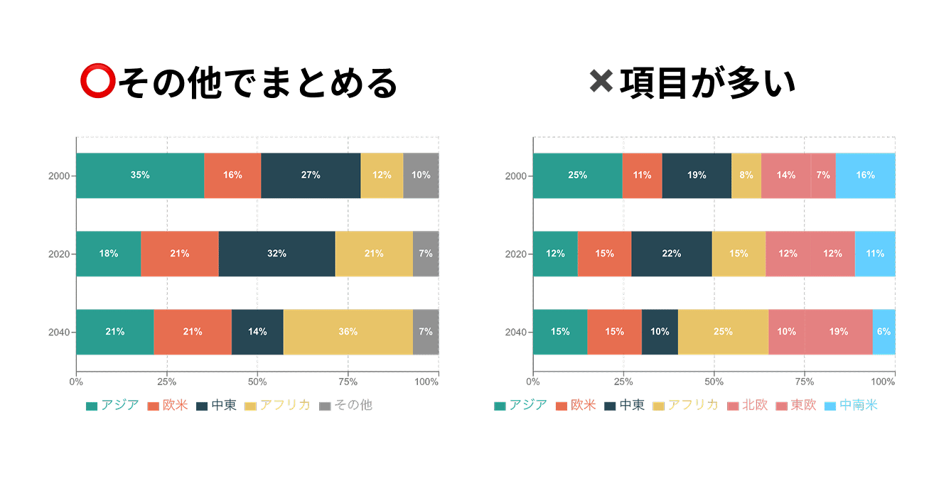 苦手なこと: 構成比のみを純粋に比較する(棒の高さが違うため、内訳の比較がしづらい場合がある)