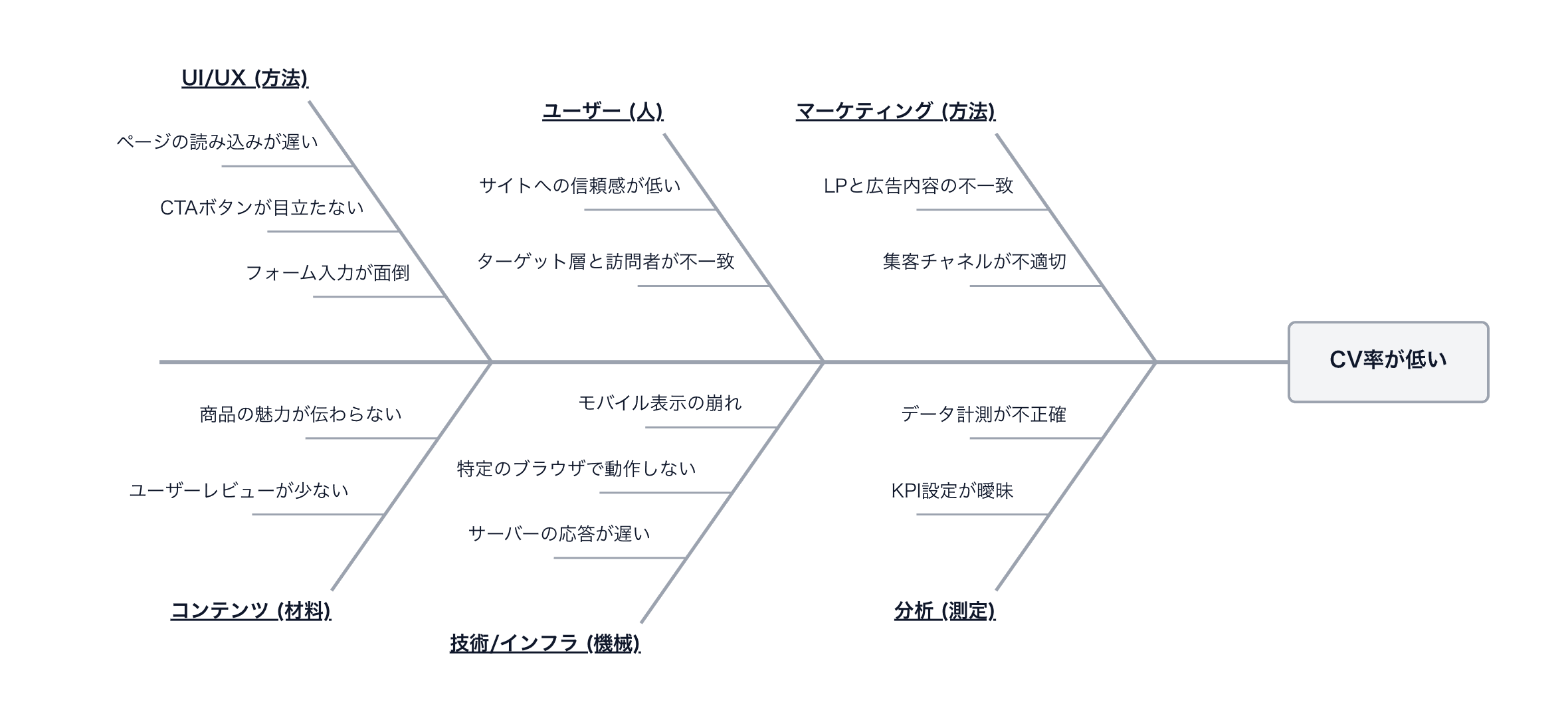 >> 特性要因図(フィッシュボーン図)のさらに詳しい解説はこちらの記事をご参照ください