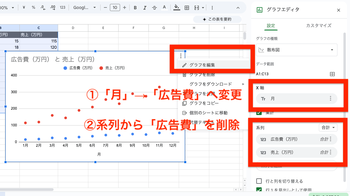 グラフを編集 > 設定 > X軸 > 「月」→「広告費」へ変更