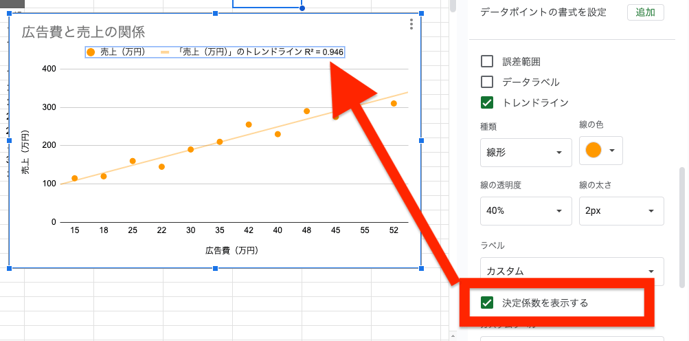 これだけで、データのおおまかな傾向を示す線がグラフに追加されます。線の種類(線形、指数など)や色、太さも変更可能です。