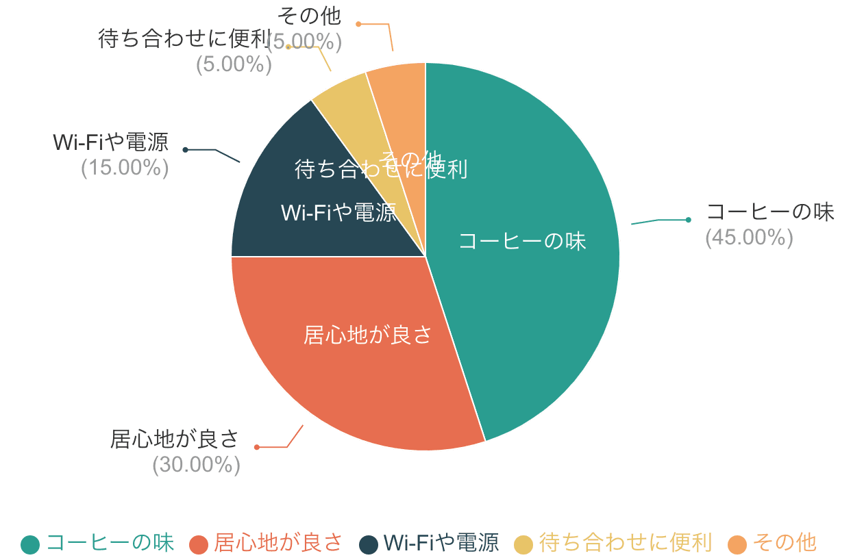 アンケートの回答結果が全体に対してどのくらいの割合を占めるのか、構成比率を示したい場合に最適なのが円グラフとドーナツグラフです。特に、回答項目が5〜6個程度までの単一回答形式の質問(例:「店に来店した一番の理由」)の結果を示すのに適しています。