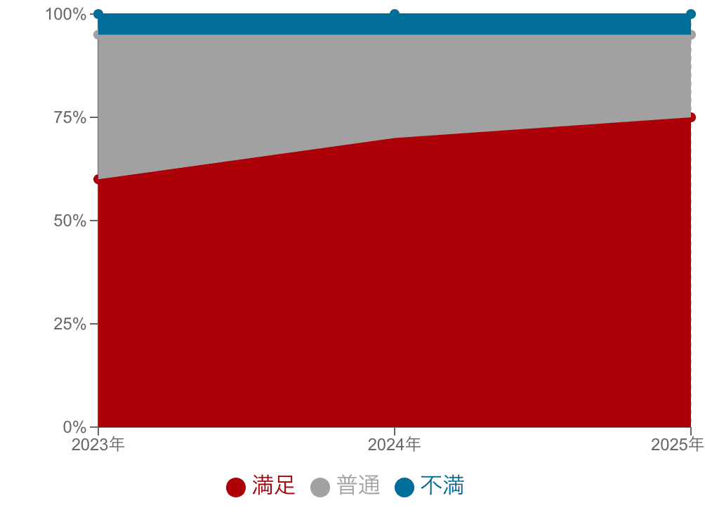 例えば、定期的に実施している満足度アンケートで、「満足」「普通」「不満」の回答比率が年度ごとにどう変わっていったかを示すのに最適です。