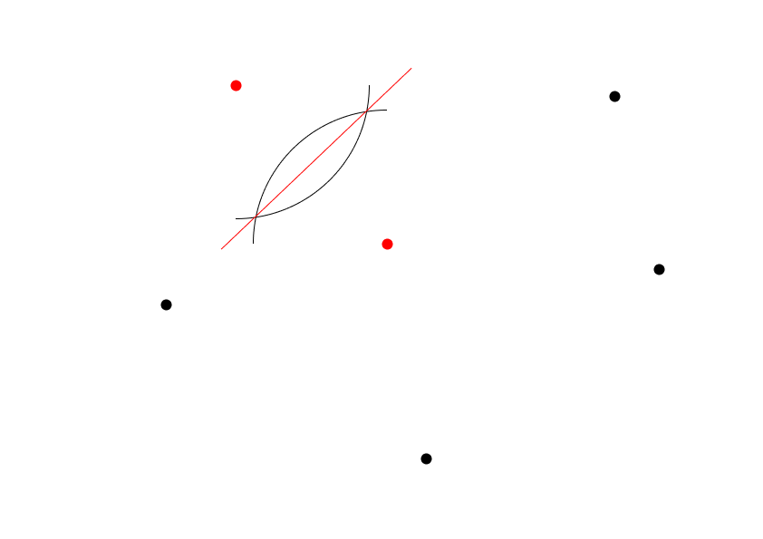 今回は例として、中心に1つ、その周りを取り囲むようにランダムに5つの点を描いてみてください。あまり規則正しく並べるよりも、少し不規則な方がボロノイ図らしい形になります。