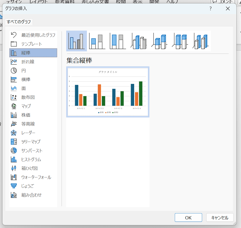 「グラフの挿入」ダイアログボックスが表示されたら、左側のメニューから作りたいグラフの種類(棒グラフ、折れ線グラフ、円グラフなど)を選び、「OK」をクリックします。今回は最も一般的な「集合縦棒」を選んでみましょう。データを入力する