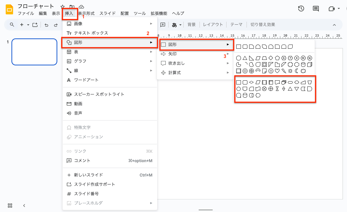 Googleスライドとドキュメントでは、標準搭載されている「図形描画」機能を使ってフローチャートを作成するのが基本です。どちらのツールでも、操作感はほぼ同じです。