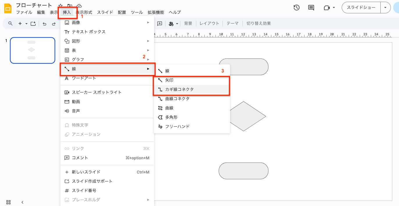 Googleスライドの場合、スライドに直接、図形や線を挿入していきます。